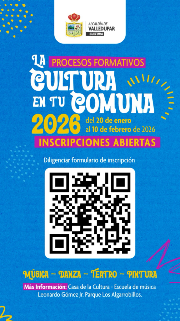 La jefe de la Oficina de Cultura, Yanelis González Maestre, destacó la importancia de esta convocatoria para continuar el desarrollo y crecimiento cultural: “Invitamos a toda la ciudadanía vallenata a inscribir a los aspirantes en estos procesos formativos que llegan a los barrios, comunas e instituciones educativas, permitiendo que niños, niñas y jóvenes encuentren en el arte una oportunidad de crecimiento personal, expresión y proyección de su talento”, señaló la funcionaria.