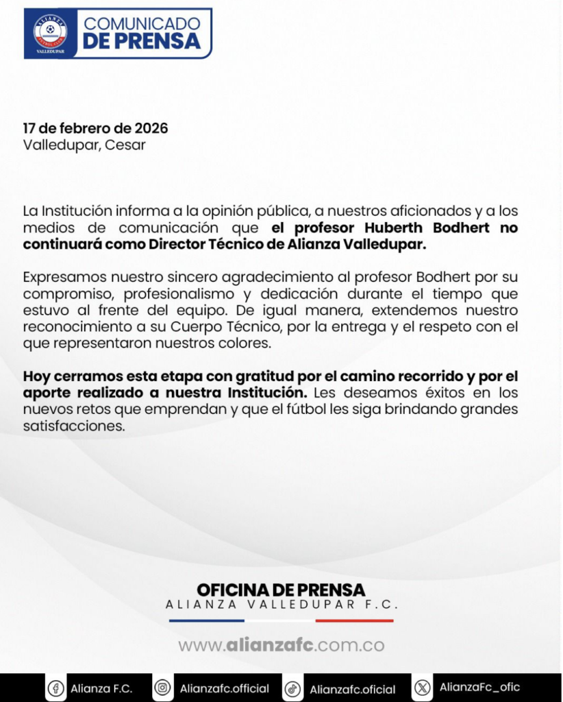 Luego del partido esta tarde entre @alianzafc.official y Cúcuta Deportivo que quedó en empate 1-1 en Valledupar, las directivas del club hicieron oficial la salida del DT Hubert Bodhert.